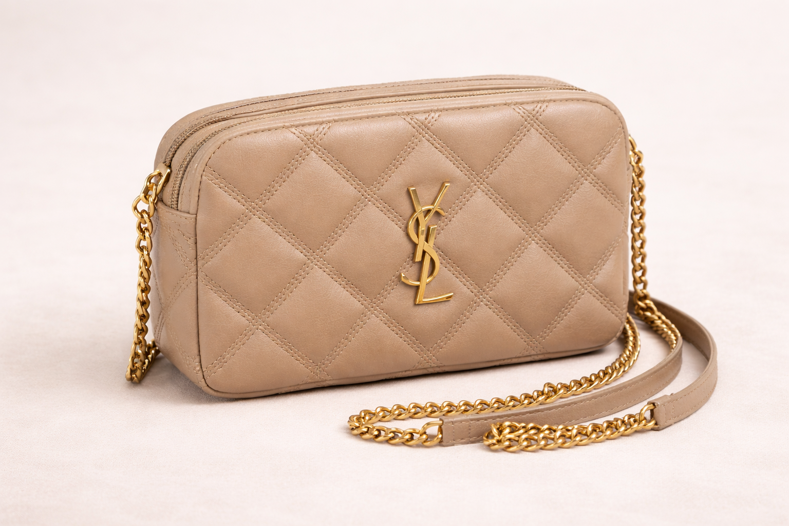 SAINT LAURENT BECKY DOUBLE ZIP CAMERA BAG – BEIGE QUILTED LEATHER